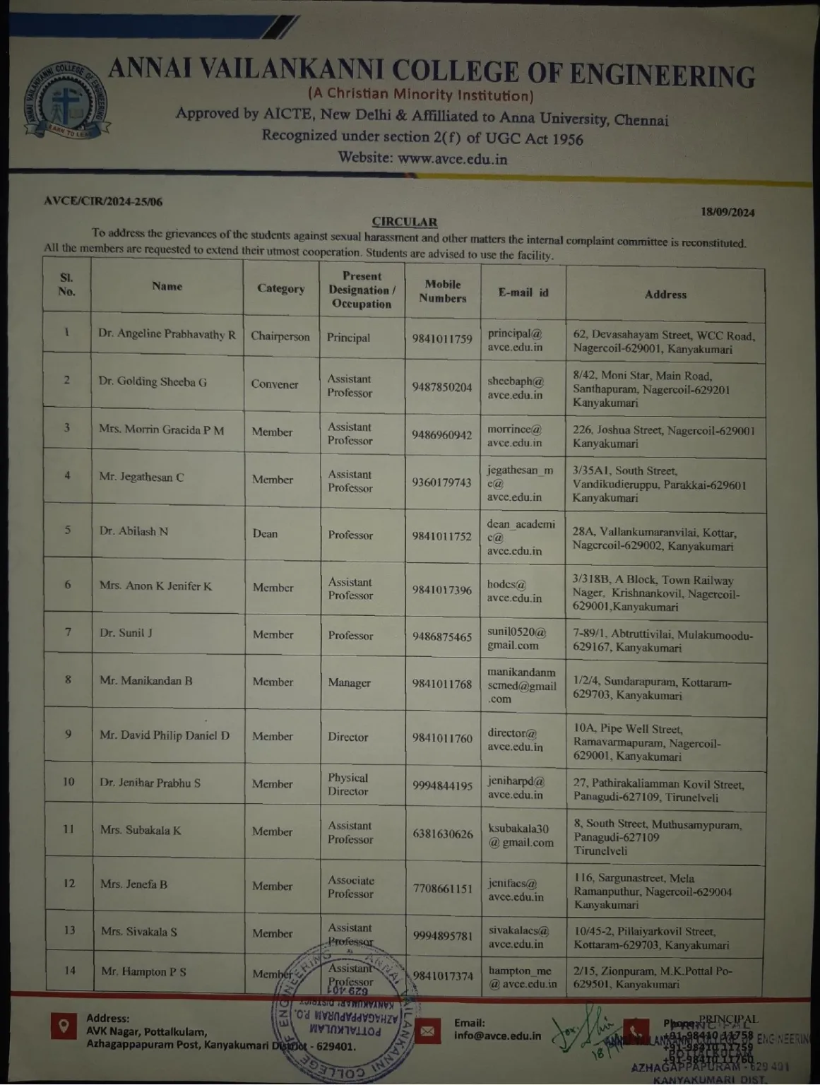 The Members of the Internal Complaints Committee are as follows :-