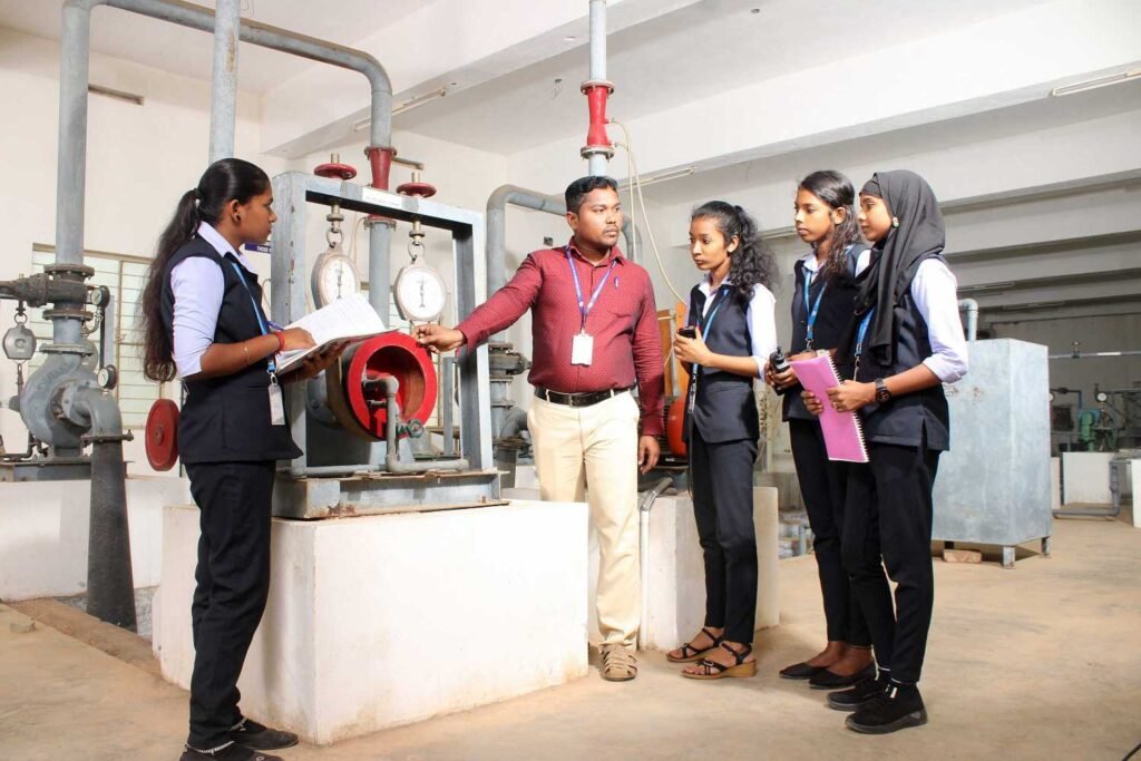This lab is well equipped with the experimental setup that aids in quantifying the flow in pipes and open channels. Facilities are available for testing the performance of various hydraulic machines such as pumps and turbines. Also, the laboratory is equipped with hydraulic flume set up in order to carry out various experiments on open channel flow. Facilities to determine the flow velocity in open channel and pipes are available. The major equipment in fluid mechanics and machinery lab are Pelton wheel setup, Kaplan turbine setup, Francis turbine setup, Pipe flow analysis setup, Flow measurement-flume assembly, Metacentric height measuring setup, Bernoulli’s theorem verification apparatus, Centrifugal pump assembly with accessories and Open channel flow measuring setup with provision for fixing notches.